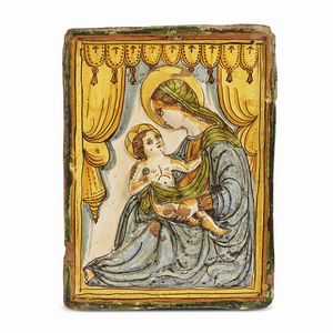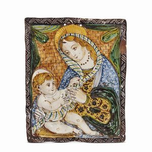PLACCA, MONTELUPO, 1666 in maiolica dipinta in policromia di forma rettangolare, raffigurante la Madonna seduta, [..]
