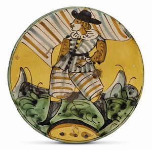 PIATTO, MONTELUPO, METÀ SECOLO XVII in maiolica dipinta in policromia, forma piana leggermente concava [..]