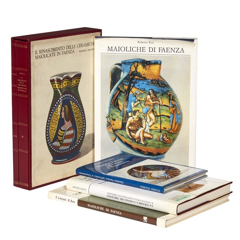 MAIOLICA. FAENZA. Lotto di 5 volumi. Il Rinascimento delle ceramiche maiolicate in Faenza, 2 voll., ristampa del 1974; Maioliche di Faenza, 1974; Maioliche di Faenza, 1990; La Ceramica a Faenza nel Trecento. Il contesto della Cassa Rurale ed Artigiana, 1992; Maioliche Faentine dall’Arcaico al Rinascimento, s.d.