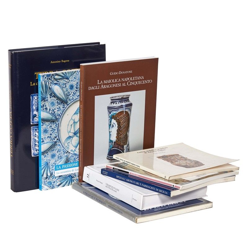 MAIOLICA. ITALIA MERIDIONALE. Lotto di 8 volumi. La maiolica di Laterza, 1980; Speziali aromatari e farmacisti in Sicilia, 1990; Terra cotta. La cultura ceramica a Caltagirone, 1991; Caltagirone. Museo regionale della ceramica, 1995; Antica maiolica popolare di Ariano Irpino, 1988; Ceramiche pugliesi dal XVII al XX secolo, 2001; La ceramica di Laterza nella collezione Tondolo, 2011; La maiolica napoletana dagli Aragonesi al Cinquecento, 2013