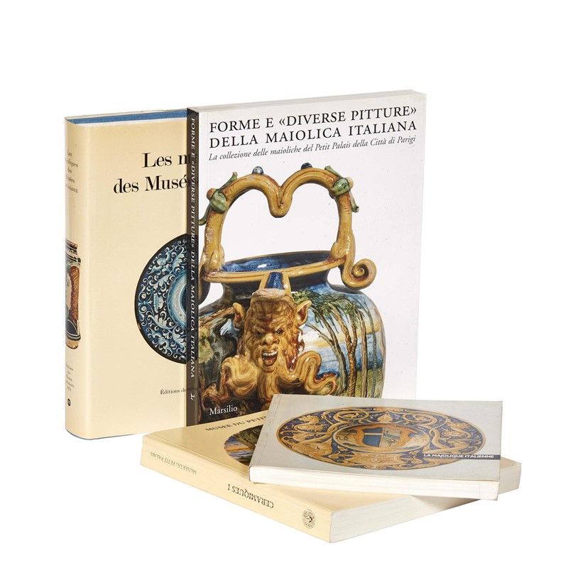 MAIOLICA. MUSEI FRANCESI. Lotto di 4 volumi. Catalogue des majoliques des musées nationaux, 1974; Museèe du Petit Palais. Catalogue des Ceramiques, I, 1984; La Majoliques Italienne dans les Musees du Nord-Pas-de- Calais, 1986; Forme e “diverse pitture” della maiolica italiana. La collezione delle maioliche del Petit Palais della Città di Parigi, 2006