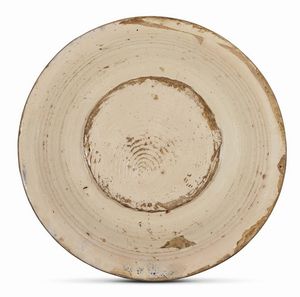 in maiolica dipinta in monocromia blu con tocco di giallo, larga tesa inclinata verso l’esterno su cavetto piano. Il decoro prevede un sottile tralcio vegetale stilizzato con motivo alla “ruota dentata” delineato sulla tesa, secondo il genere classificato da Fausto Berti come “famiglia bleu”, mentre il cavetto è interamente riempito dalla figura di un volatile circondato da minuti tratti spiraliformi; diam. cm 33,2, diam. piede cm 16,5, alt. cm 5,3
