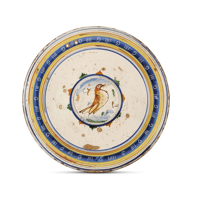 in maiolica dipinta in policromia, larga tesa inclinata su cavetto piano. La decorazione, riferibile al gruppo che Fausto Berti individua come “estenuazione dei motivi rinascimentali”, prevede una serie di fasce concentriche sulla tesa, di cui la più rilevante è dipinta in blu con decori a graffito, mentre il centro del piatto è occupato da un medaglione circolare orlato di blu dipinto con un volatile in un paesaggio silizzato; diam. cm 31,8, diam. piede cm 15,5, alt. cm 4