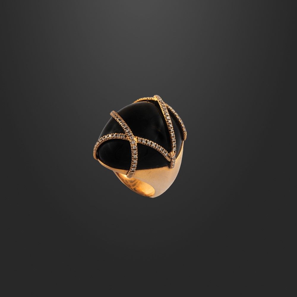 in oro rosa con grande onice ovale cabochon entro motivo ad intreccio in brillanti, gr. 31,1.