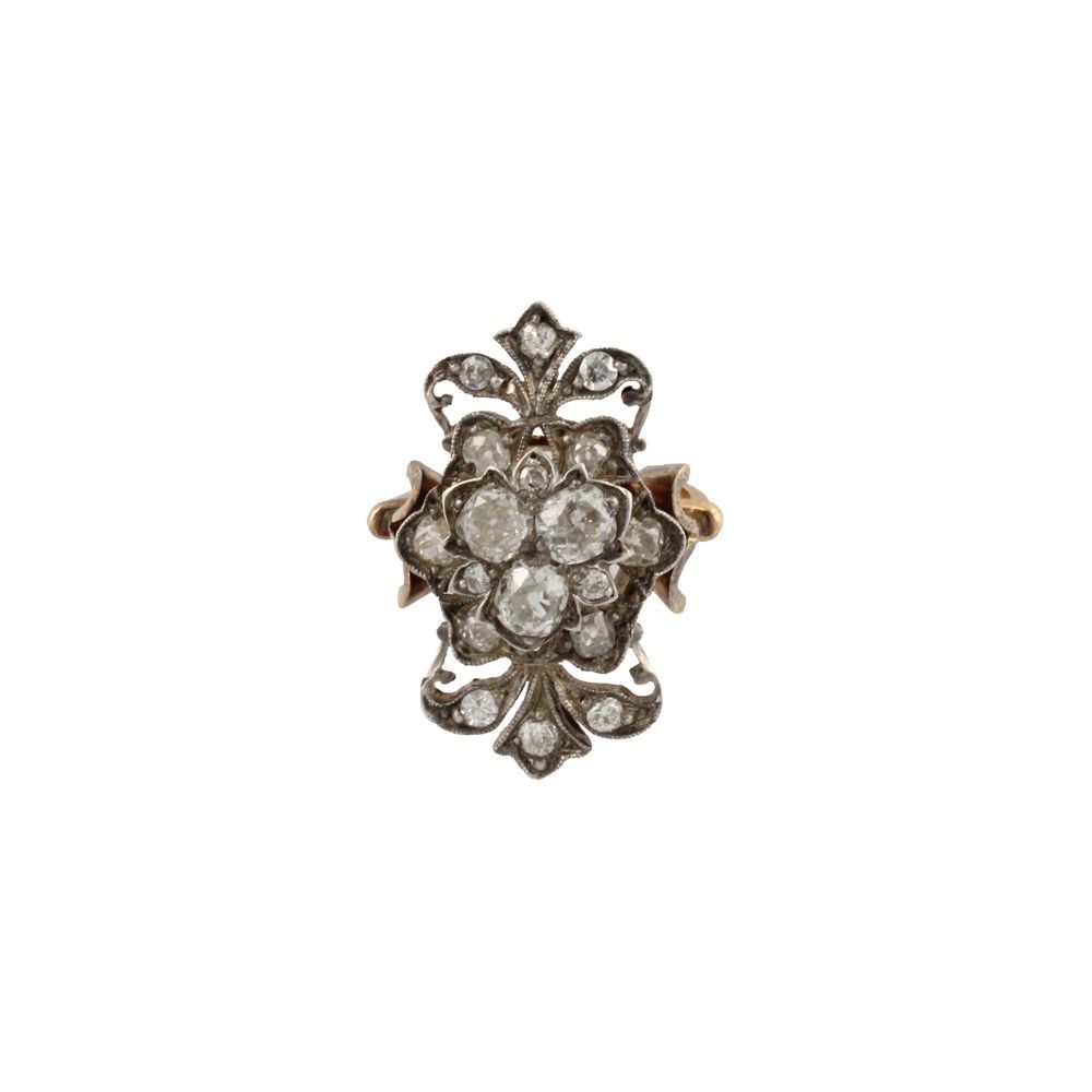 in argento e oro traforato a motivi floreali con diamanti del peso complessivo di 2,30 ct ca., gr. 12,6.