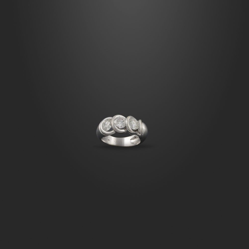 in oro bianco a fascia bombata con tre brillanti del peso complessivo di 2,10 ct ca., entro castoni sovrapposti disposti in linea, gr. 10,5.