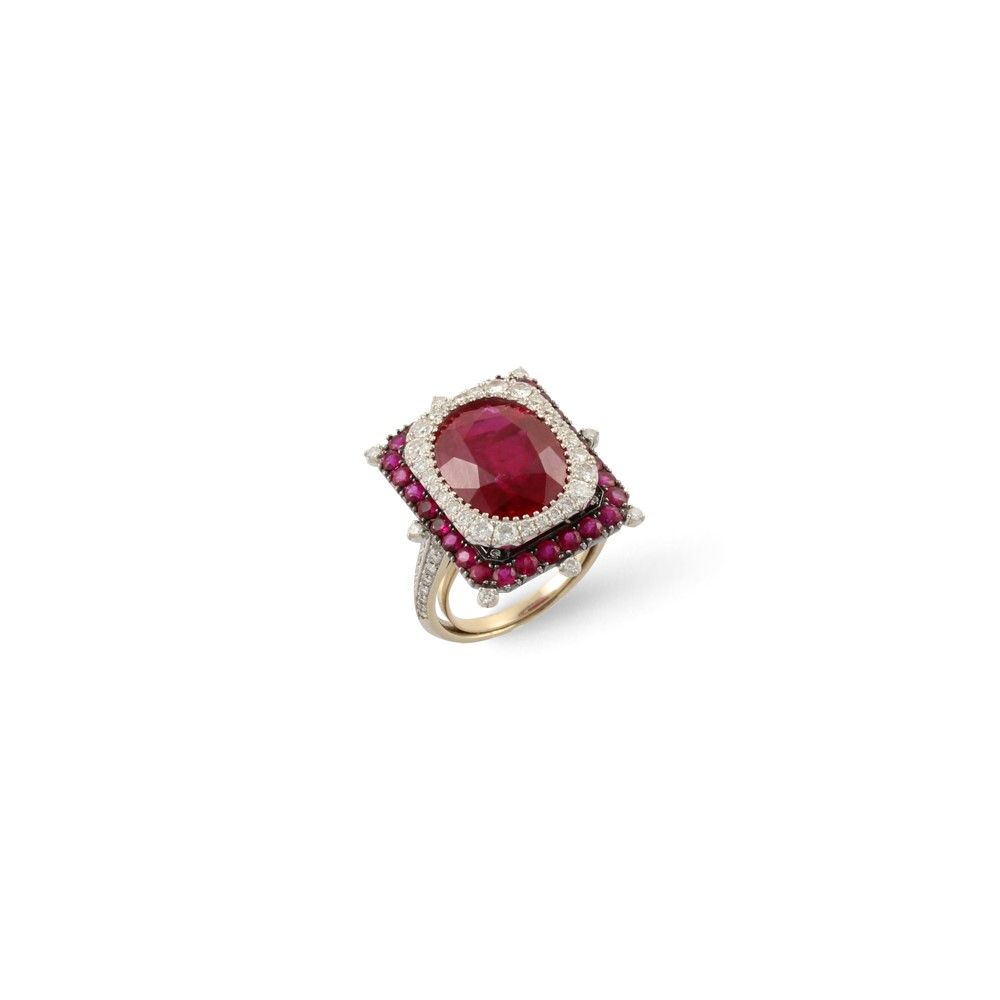 in oro bianco con rubino ovale del peso di 7,20 ct ca. contornato da brillanti entro cornice rettangolare in rubini tondi. Profilo esterno punteggiato da brillanti sparsi che vengono ripresi anche sul gambo, gr. 8,9.