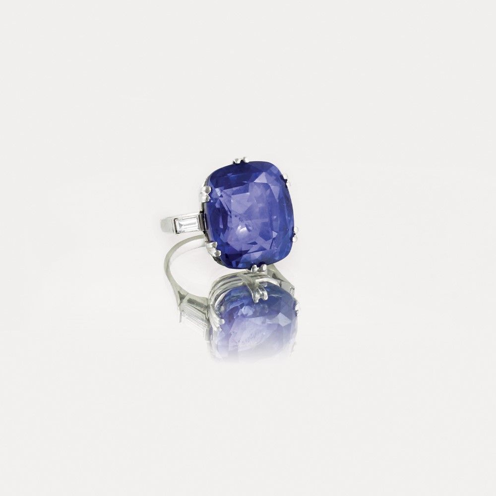 in platino con zaffiro taglio cuscino del peso di 29,90 ct. affiancato da due diamanti baguette, gr. 13,7. Misura 10 Analisi gemmologica n. 44452 del 13/03/2018 rilasciata dal laboratorio IGI di Milano attestante che lo zaffiro è di provenienza Sri Lanka e non ha subito trattamento termico