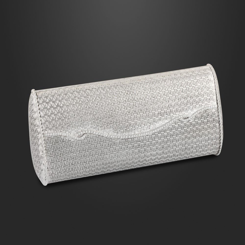 oro bianco lavorato a motivo impagliato con specchio all’interno, apertura profilata da brillanti del peso complessivo di 1 ct ca., peso netto gr. 341.