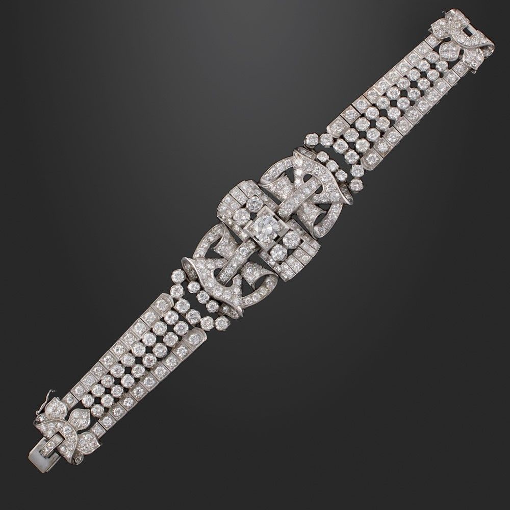 a larga fascia in platino e brillanti con motivo superiore ad elementi geometrici evidenziato al centro da un brillante del peso di 1,50 ct ca., restanti brillanti del complessivo di 32,00 ct ca., gr. 83,2.