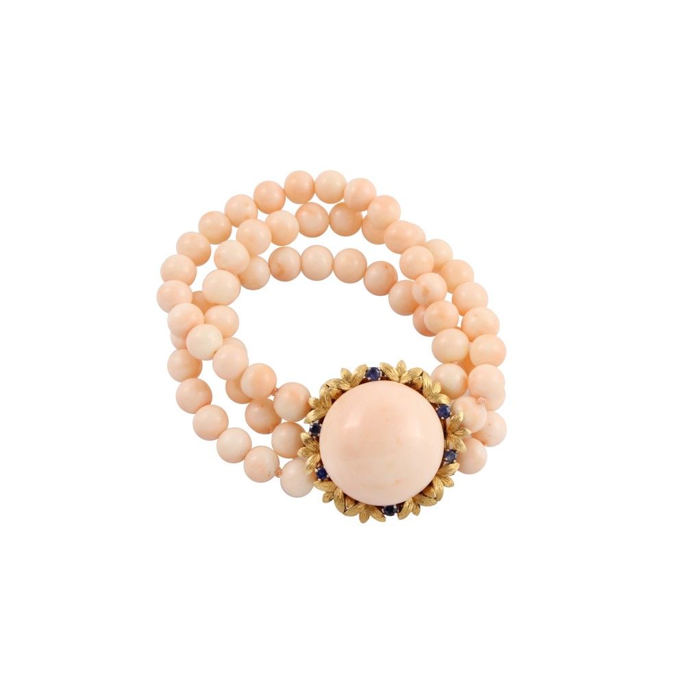 costituito da tre fili di sfere di corallo con fermezza in oro giallo a motivi fogliacei ornata da zaffiri e centrata da un grande corallo tondo taglio cabochon, gr. 94,3.