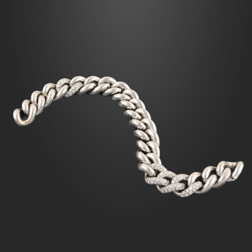 groumette in oro bianco, alcune maglie in pavé di brillanti del peso complessivo di 3,20 ct ca., gr. 79.Lunghezza 19,5 cm