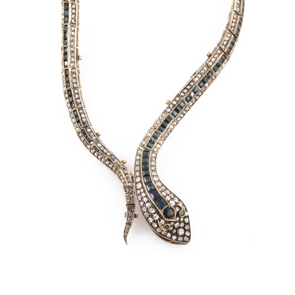 in argento e oro raffigurante un serpente snodato interamente percorso da diamanti e zaffiri carré, la testa in pavé di diamanti con occhi in smeraldo è evidenziata sulla sommità da uno zaffiro tondo, gr. 79,7 (due diamanti e uno zaffiro mancanti)