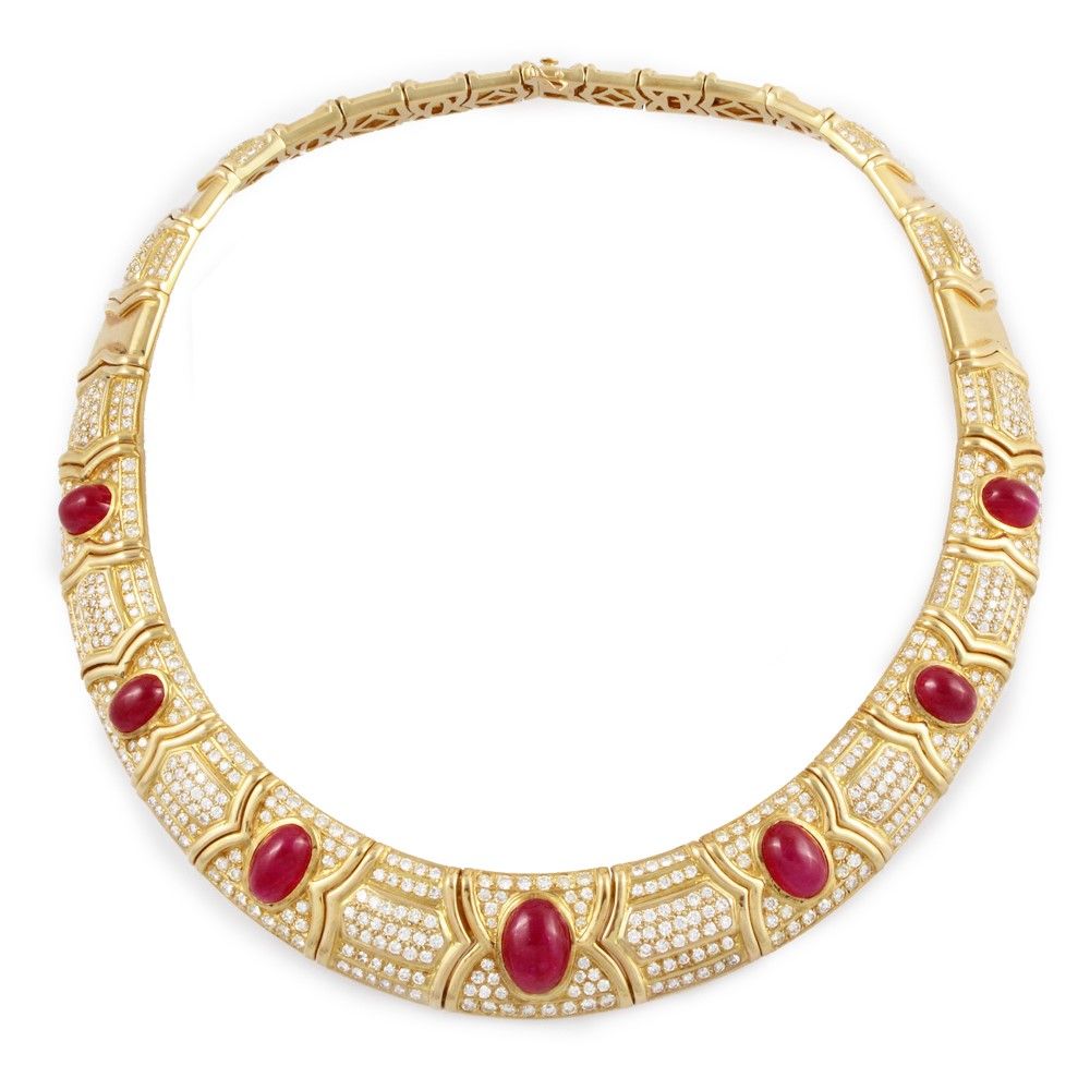 girocollo a nastro semirigido in oro giallo costituito da elementi geometrici in pavé di brillanti del peso complessivo di 10 ct ca., ornato anteriormente da sette rubini ovali cabochon del peso complessivo di 48 ct ca., gr. 176,6