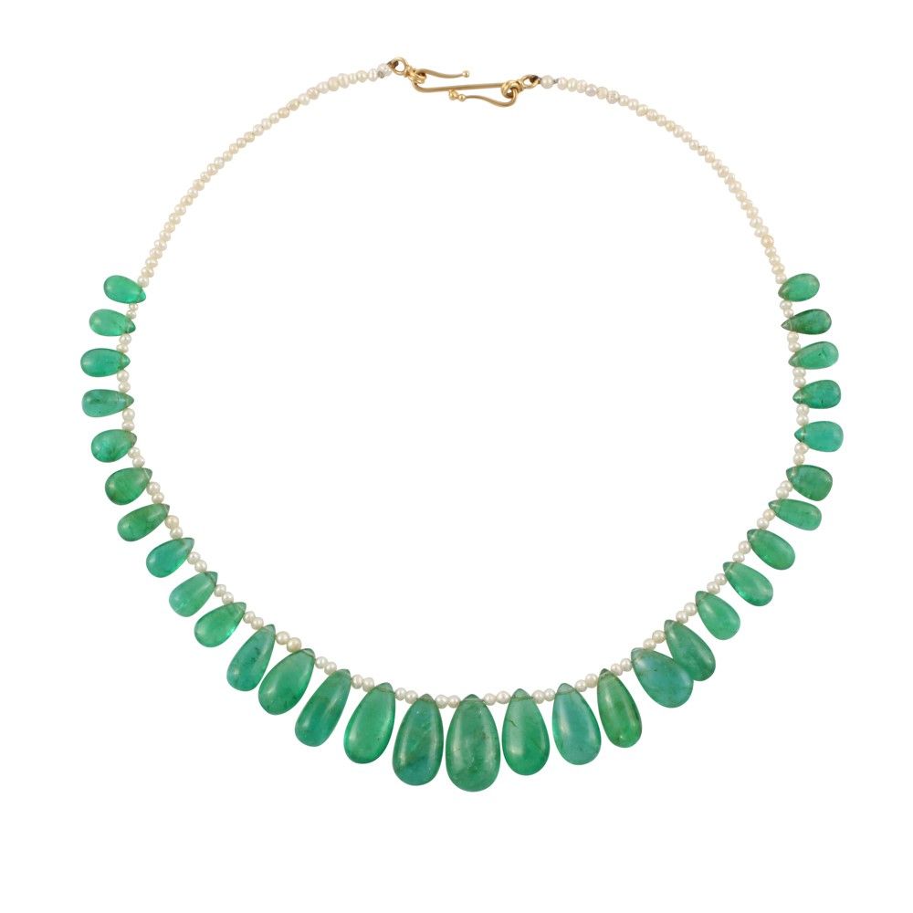 con trentuno smeraldi a goccia a scalare del peso complessivo di 130 ct ca., sostenuti da un filo di piccole perle d’acqua dolce, chiusura in oro giallo a gancio, gr. 32.