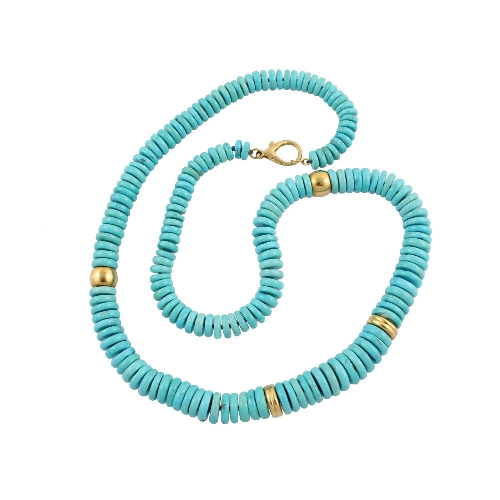 costituita da un filo con dischetti a scalare di turchese intervallati nella sezione centrale da quattro rondelle in oro giallo, chiusura a moschettone, del peso complessivo di gr. 170.