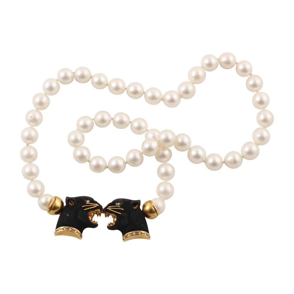 un filo di perle coltivate 8,5 mm con chiusura raffigurante due teste di pantera contrapposte in oro giallo e brunito con piccoli brillanti, gr. 69,8.