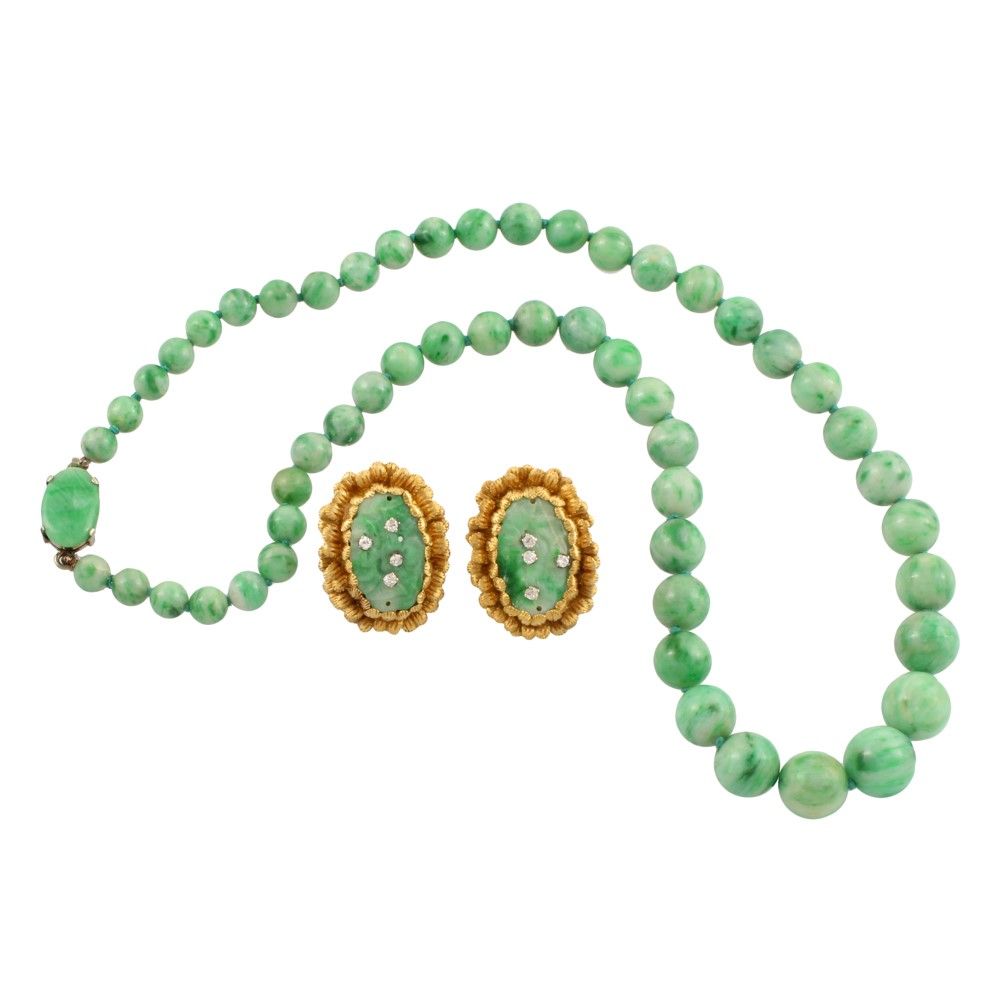 girocollo ad un filo di sfere di giadeite a scalare, 12,1/6,5 mm con chiusura in oro bianco e placca ovale in giadeite. Orecchini in oro giallo ciascuno con al centro una placca in giadeite incisa a motivi vegetali punteggiata di brillanti, gr. 85,2. Lunghezza 50 cm