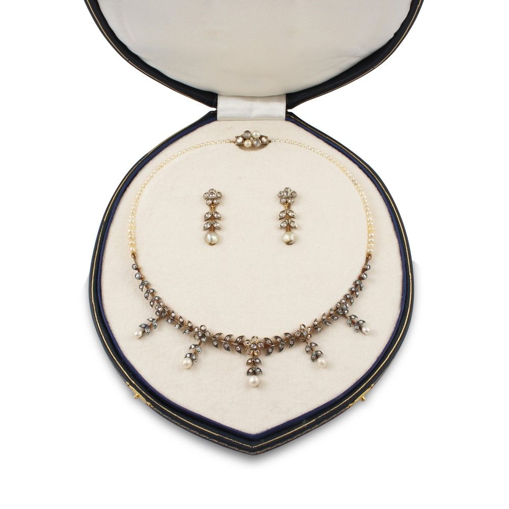 in oro e argento con diamanti a rosa, ornata anteriormente da motivi floreali e cinque pendenti con perle naturali d’acqua salata 5,35-5,50/3,70-4,70 mm, sostenuta da un filo di perle poste in gradazione, chiusura a losanga con perle e diamanti; orecchini pendenti in oro giallo “en suite”, gr. complessivi 29. Corredata da custodia.