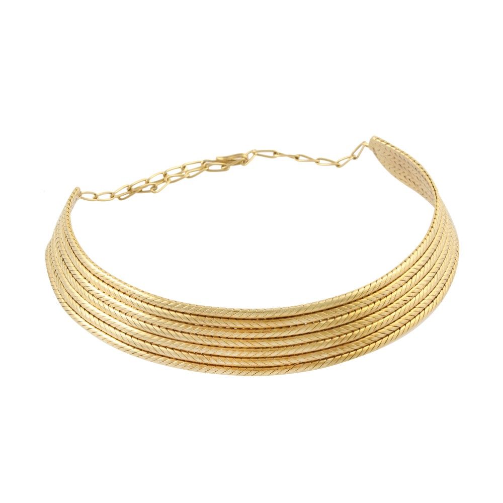 in oro giallo a morbido nastro a motivo spigato con catena terminale e chiusura a gancio, gr. 87,2