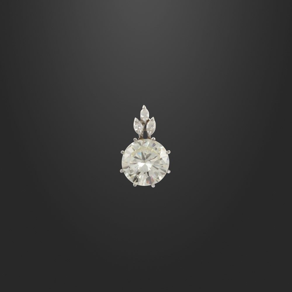 taglio a brillante del peso di 8,28 ct, montatura in oro bianco con tre piccoli diamanti navette, gr 2.
