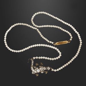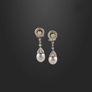 pendenti in oro bianco e brillanti del peso complessivo di 0,70 ct ca, ciascuno con perla a goccia terminale [..]