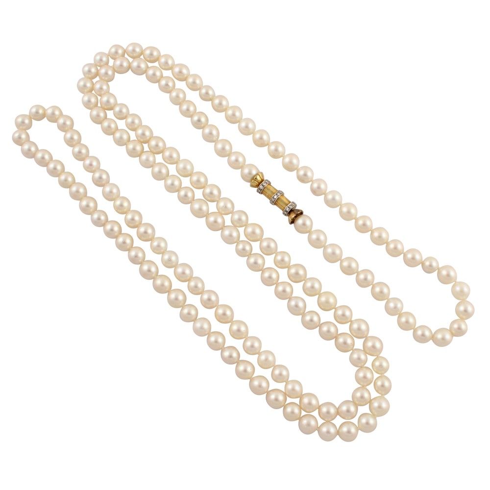 a un filo di perle coltivate 8,5 mm, con chiusura in oro giallo e bianco a forma tubolare con tre file di brillanti lungo la circonferenza.