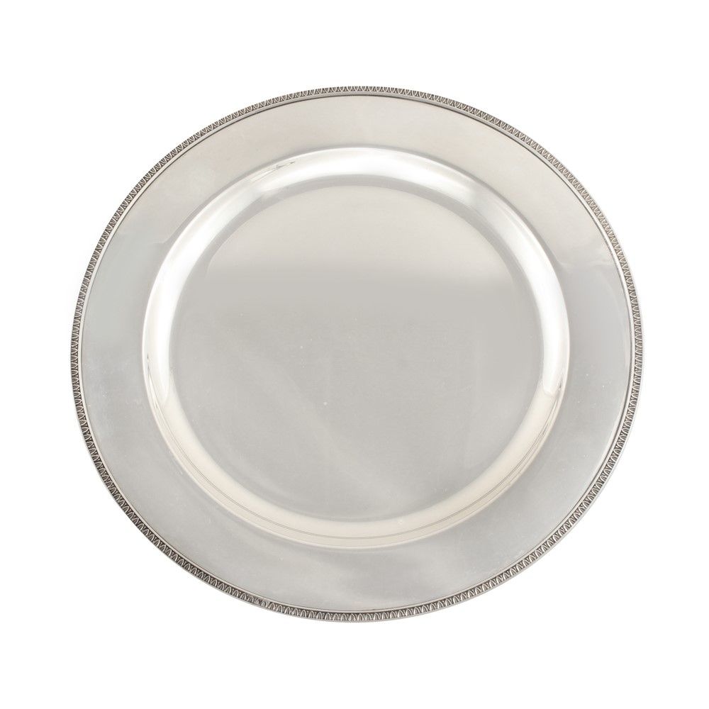 in argento 925 a corpo circolare liscio con tesa a larga fascia e bordatura a palmette, gr. complessivi 4727 ca., diametro 28 cm.