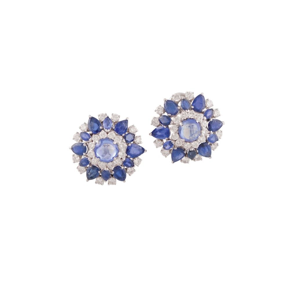 tondi in oro bianco, ciascuno con zaffiro cabochon al centro contornato da brillanti e zaffiri a goccia e taglio navette. Brillanti del peso complessivo di 2,40 ct ca., gr. 13,3.