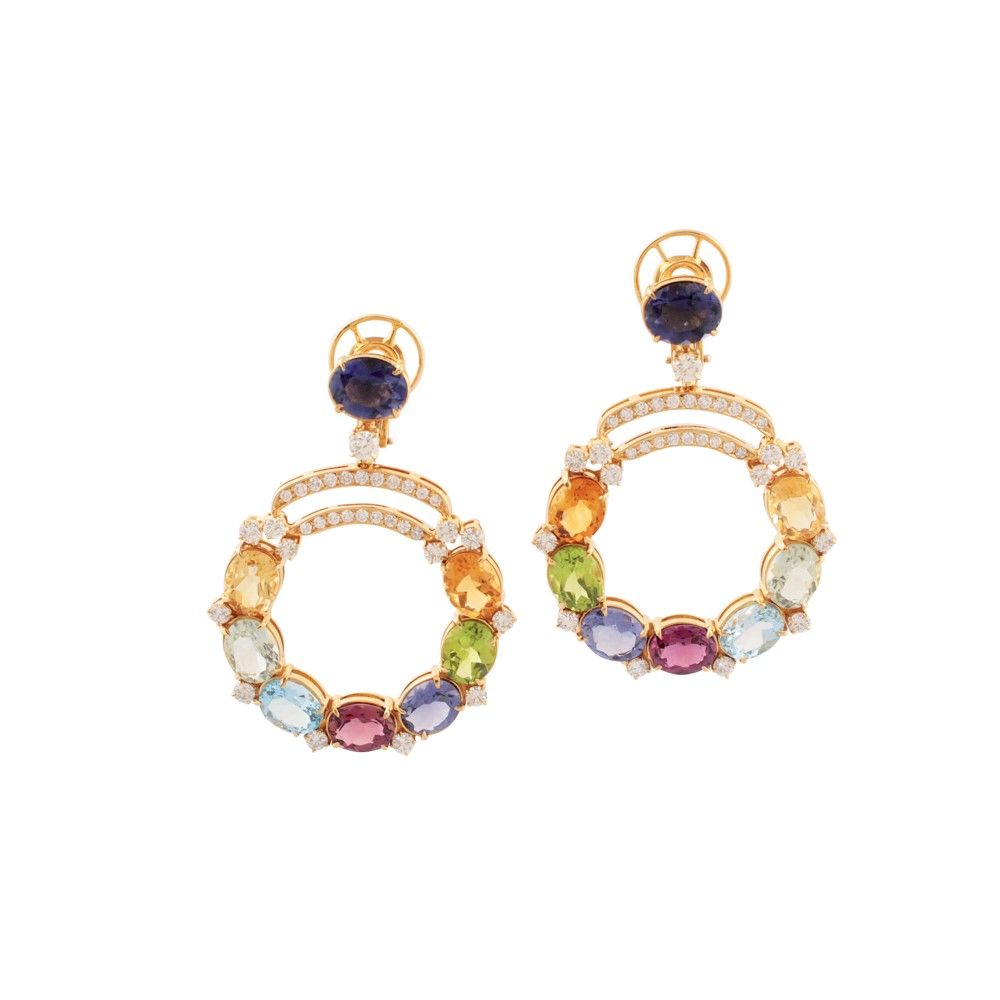 pendenti in oro giallo, ciascuno con tanzanite ovale a sostegno di un cerchio percorso da gemme ovali: quarzi, peridoto, iolite, rubellite e topazio azzurro con decori in brillanti. Brillanti del peso complessivo di 3 ct ca., gr. 37,9.