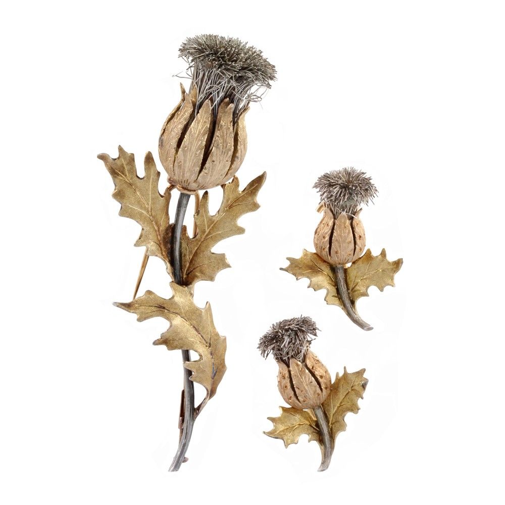 di spilla e orecchini raffiguranti un cardo fogliato in oro giallo e argento, gr. 37,7.