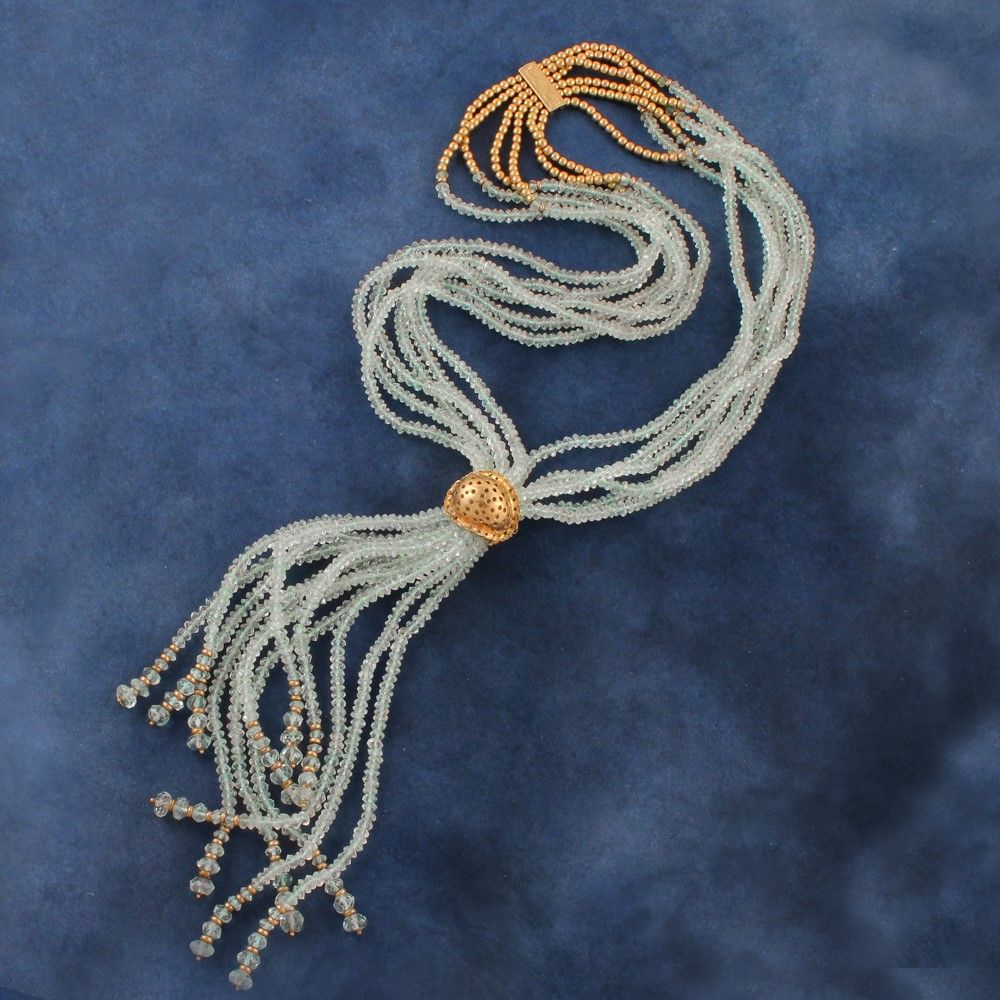 a sei fili di acquamarine sfaccettate raccordate da sfere e motivo rettangolare in oro a titolo basso, saliscendi a cupola traforata, gr. 136,3
