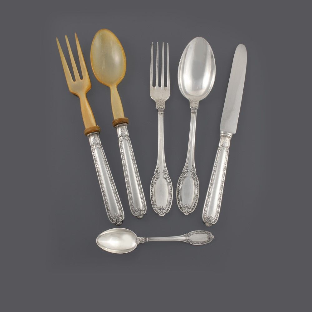 in argento composto da 101 pezzi. Lame dei coltelli da carne e da frutta in metallo, terminali delle posate da insalata in osso. Manici decorati a palmette, gr. 4194 ca. (escluse le posate con parte non in argento).