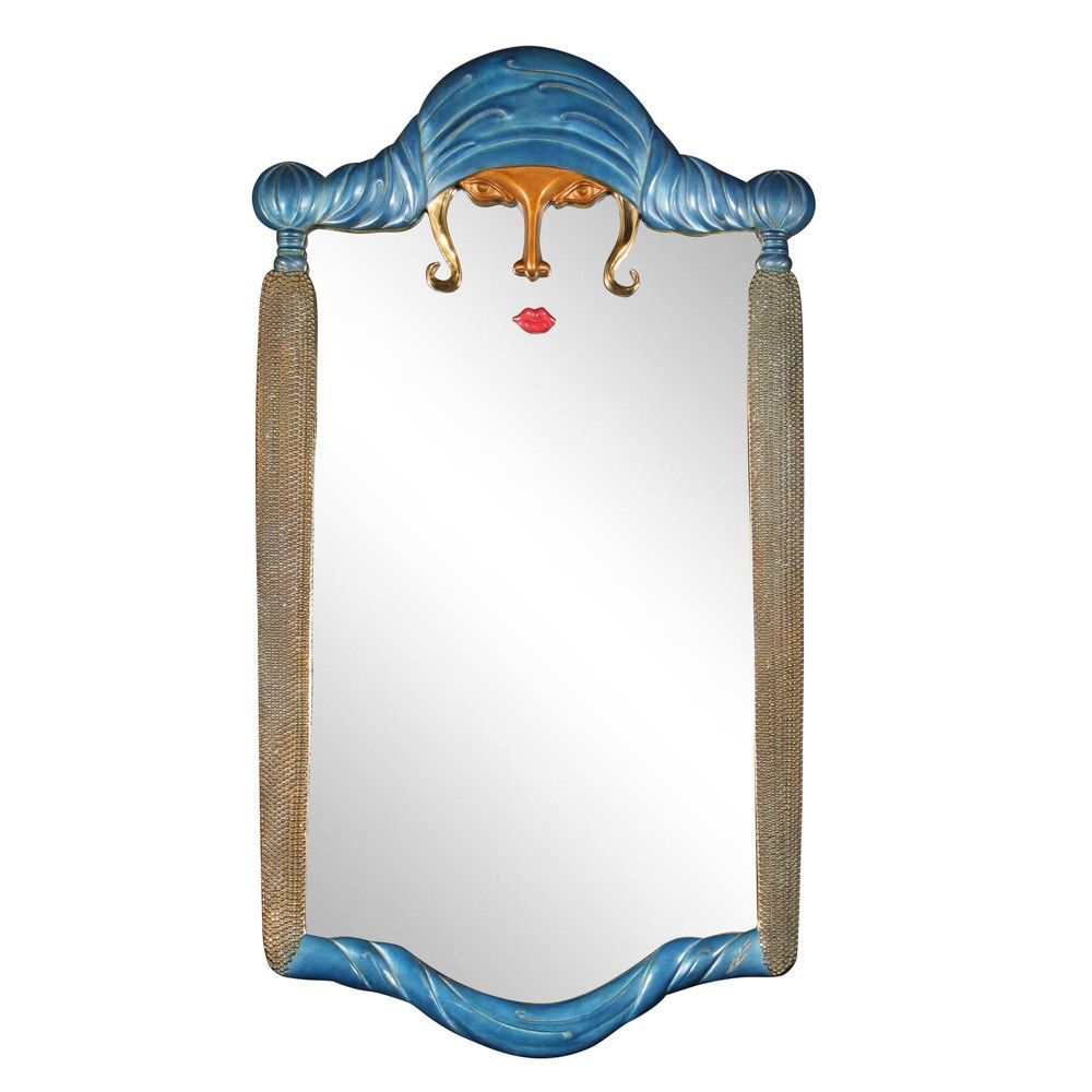 rara specchiera da parete in bronzo policromo raffigurante sulla sommità un volto femminile stilizzato con turbante, a lato perlinature dorate e base sagomata a drappeggio nei toni del blu.