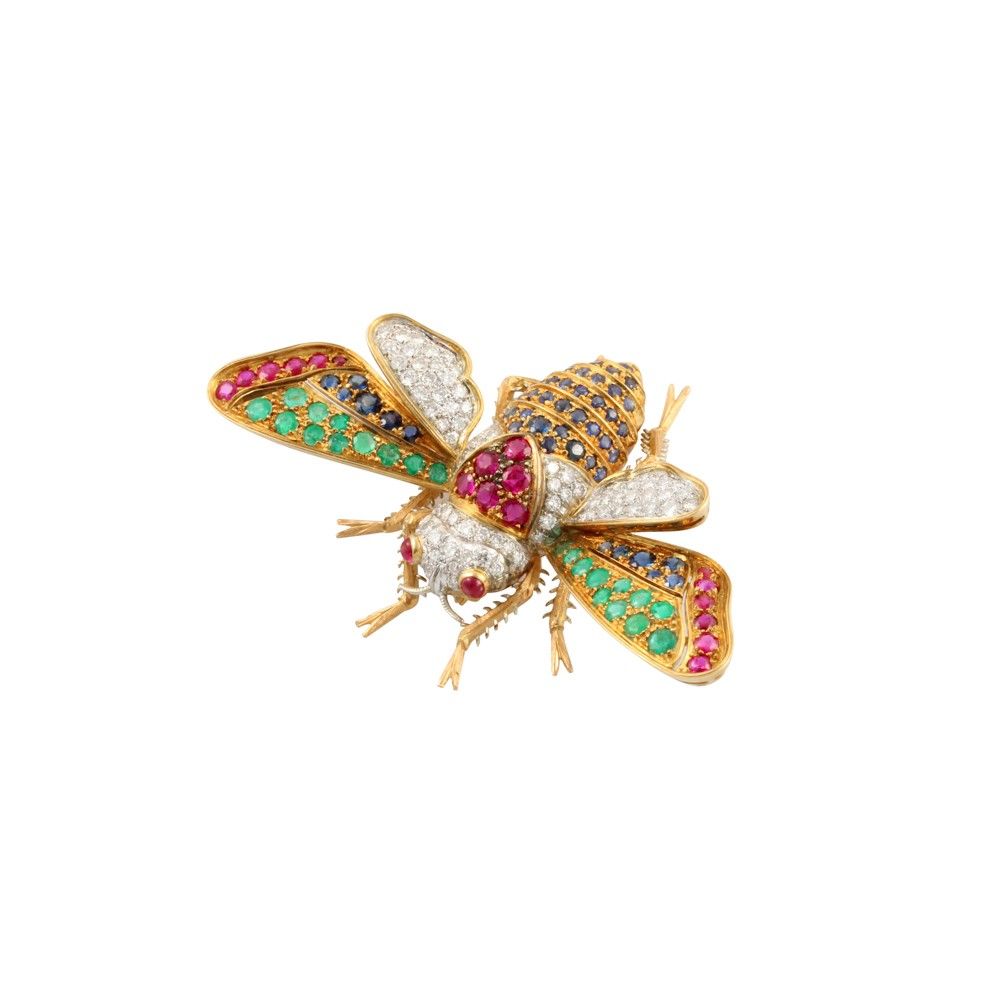 in oro giallo e bianco raffigurante un’ape ornata da brillanti rubini, smeraldi e zaffiri, gr. 22,5.