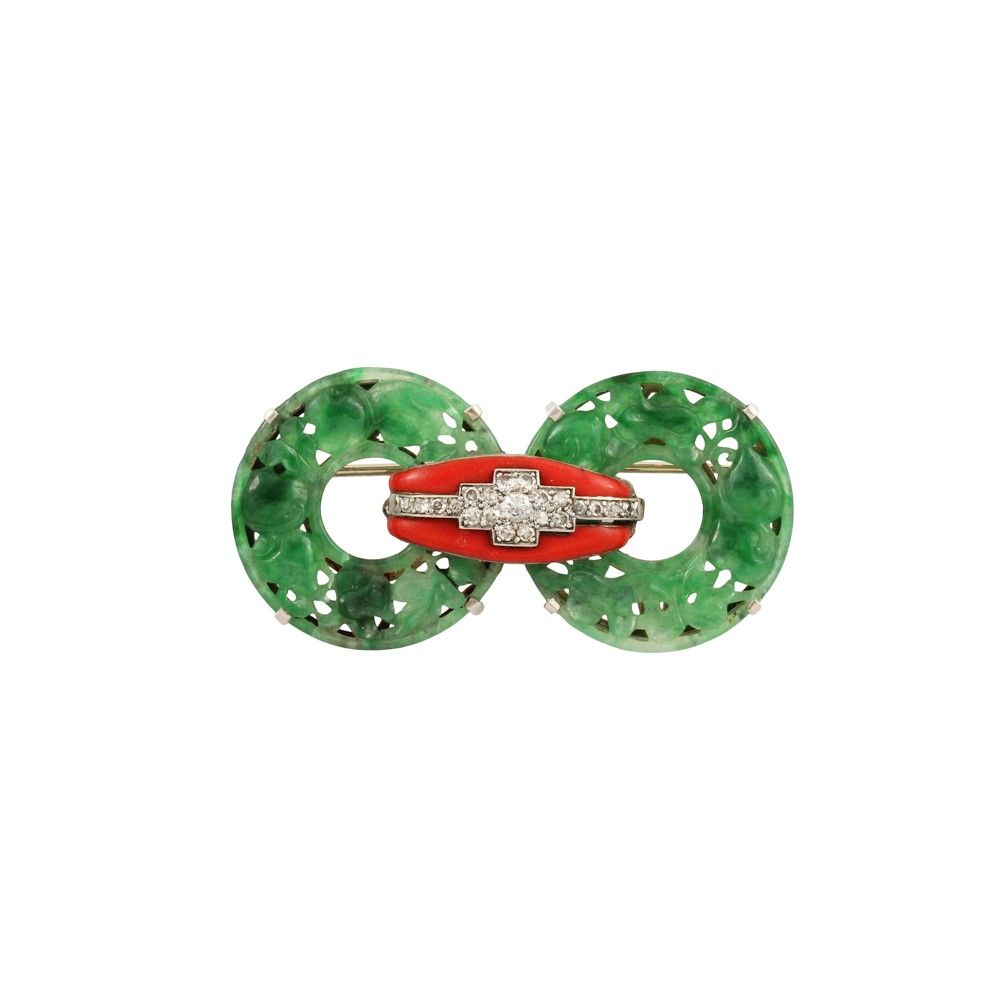 in oro bianco e platino costituita da due cerchi di giada incisa a motivi vegetali uniti tra loro da un cavallotto in smalto rosso con riporto in platino e diamanti, gr. 17,7.