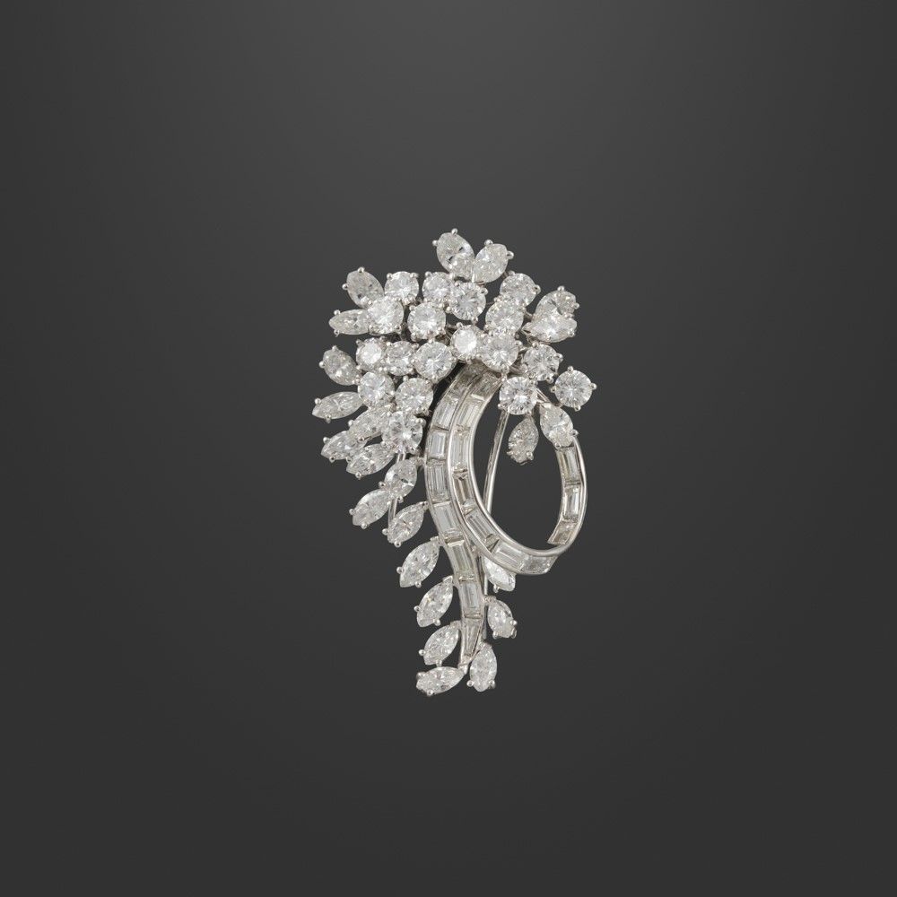 a clip in platino a motivo vegetale stilizzato con brillanti, diamanti navette e baguette. Diamanti del peso complessivo di 9 ct ca., gr. 19.