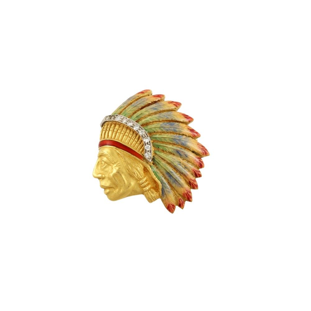in oro giallo raffigurante profilo di indiano con copricapo in smalti policromi e riporto in oro bianco con piccoli brillanti, gr. 12,6