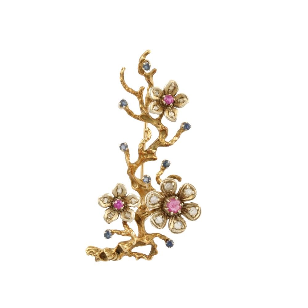 ramage con fiori in oro giallo ornata da rubini, diamanti taglio a rosa e piccoli zaffiri, gr. 12,8.