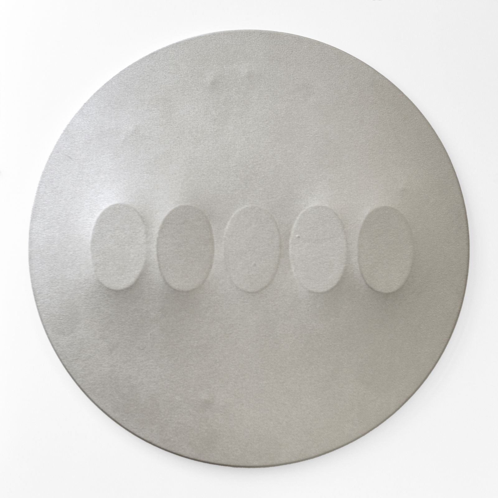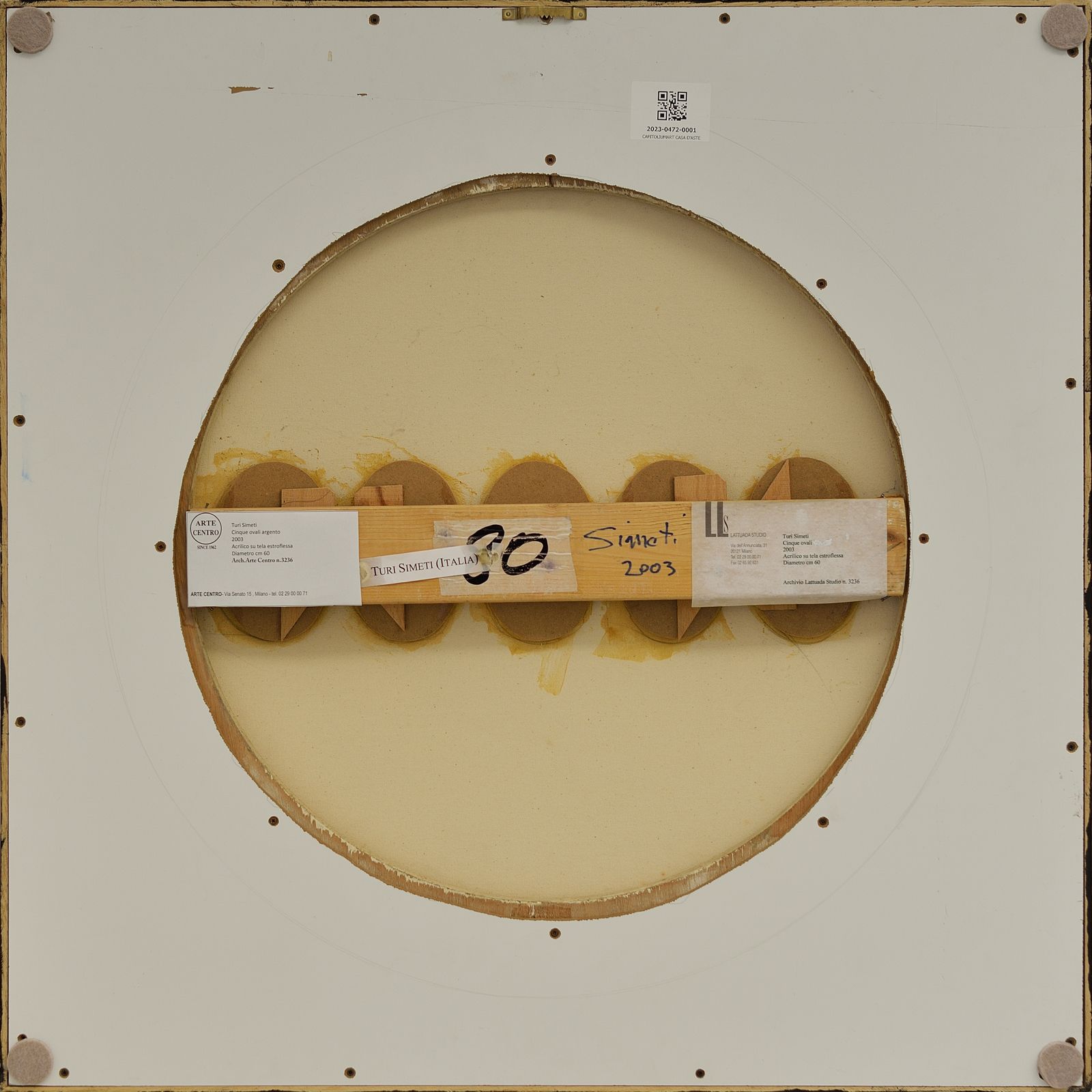 Al retro firma, anno, cartiglio descrittivo Arte Centro, Milano e cartiglio descrittivo Galleria Lattuada, Milano. Opera archiviata presso Fondazione Archivio Turi Simeti, Milano, come da documentazione fotografica allegata all'opera. Diametro 60 cm. Provenienza: Arte Centro, Milano. Galleria Lattuada, Milano. Collezione privata, Torino.