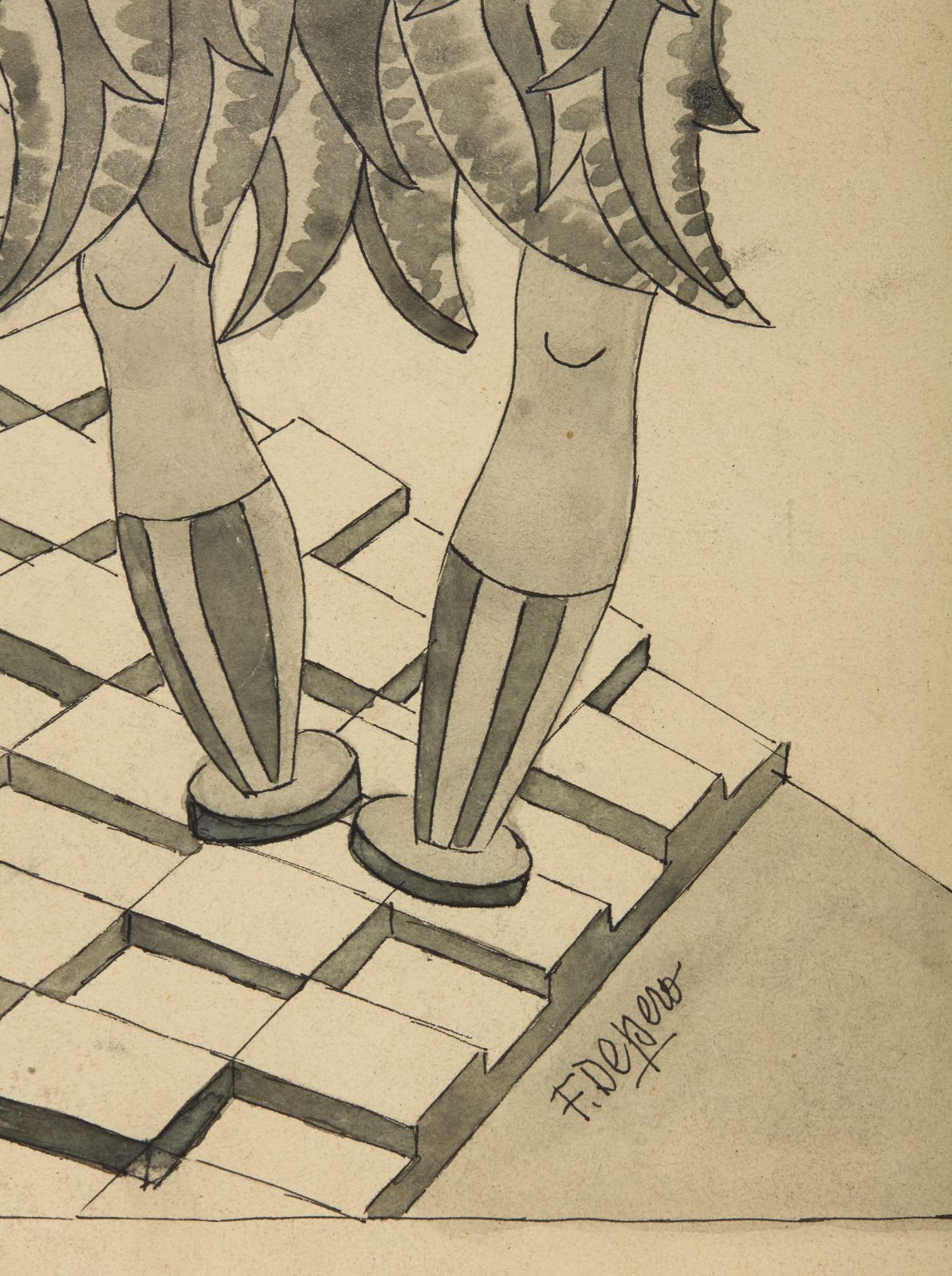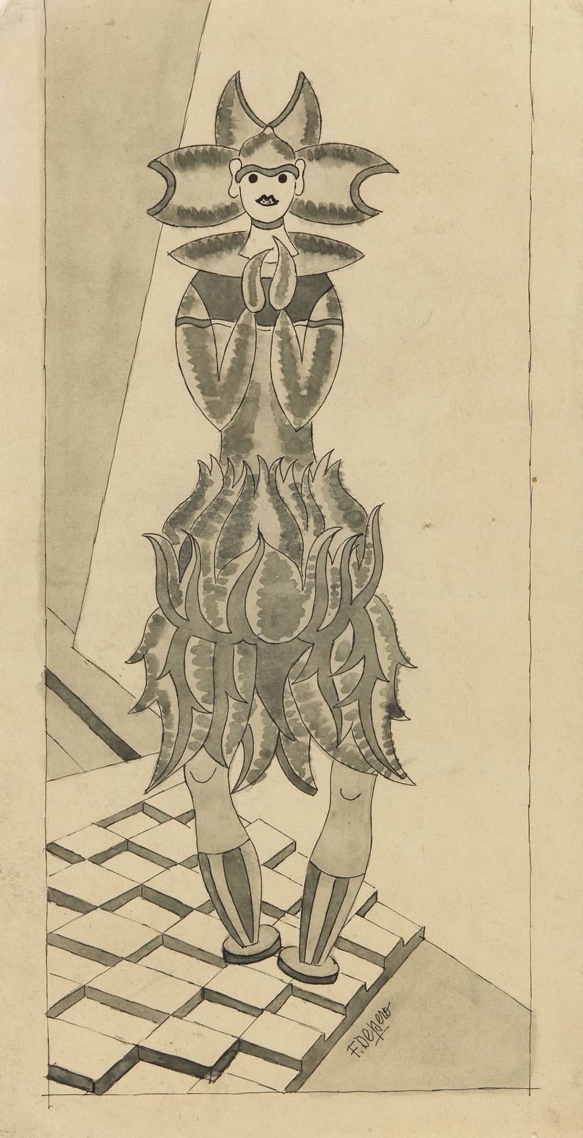 Firma in basso a destra. Opera archiviata presso l'Archivio Unico per il catalogo delle opere futuriste di Fortunato Depero, Rovereto, come da documentazione allegata all'opera riportante il relativo numero d'inventario. 1948 circa. Lievi difetti.'Dal 1947 al 1949 Depero ritentò la seconda carta americana e tornò a New York con alcune difficoltà iniziali. Poi, grazie ad una vecchia amicizia riusci a trovare ospitalità presso una villetta di Marry Hall, nella verde campagna del Connecticut, e li per oltre un anno e mezzo, fino all'autunno del 1949, lavorò intensamente disegnando e dipingendo.Riprese in mano anche vecchie idee e progetti teatrali del periodo romano e caprese (1915-1918), come scenografie, e costumi teatrali, come è il caso di questa Ballerina floreale, lontana reminiscenza dell'esperienza de 'Il Canto dell'Usi-gnolo' di Stravinsky, del 1917, purtroppo non andato mai in scena.Sulla base di questo disegno, sempre nel 1948, Depero realizzò anche un dipinto ad olio, esposto nel 1985 presso Mazzoleni Arte a Milano ('Depero. Dal primo Futurismo agli anni Cinquanta', a cura di Giorgio Ferrari, 23/4-18/5/1985).'