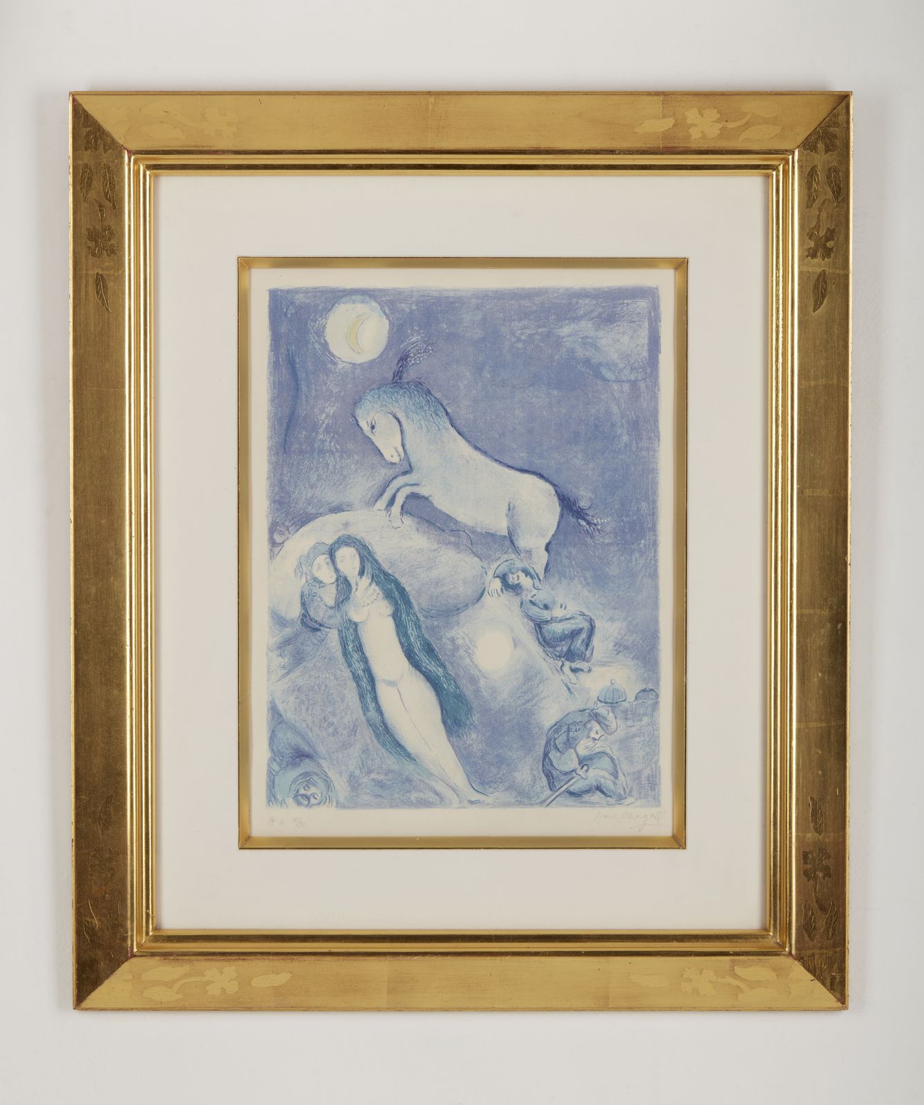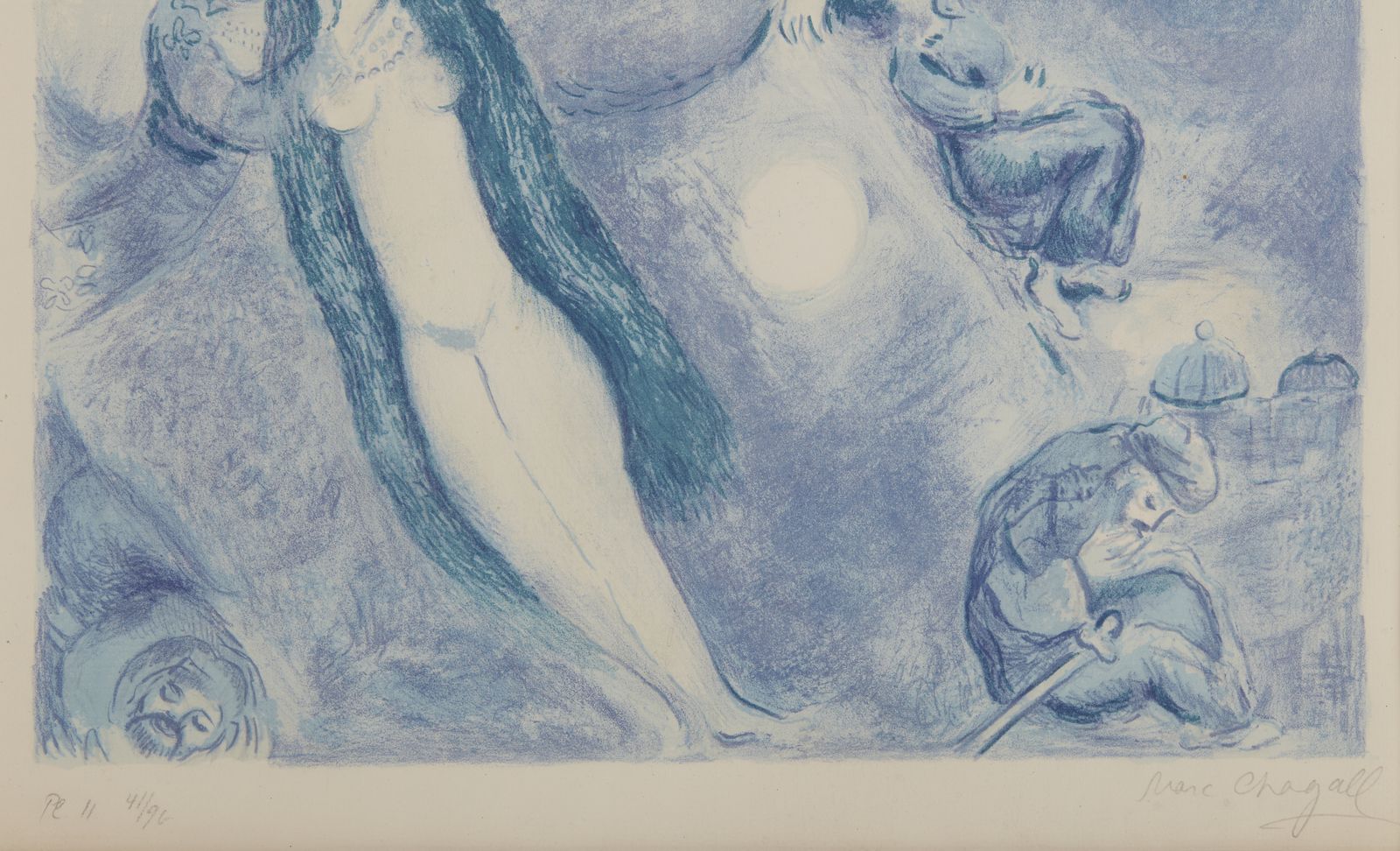 Pl. 11. 41/90. Tiratura e firma in basso a matita. Tavola 11, proveniente da una serie completa di 12 litografie stampate a colori dei Quattro racconti delle Mille e una notte illustrate da Marc Chagall. Edizione totale: 90 esemplari + un'edizione deluxe di dieci esemplari in numeri romani + una lastra aggiuntiva + p.d.s. + 11 copie hors commerce. Editore: Pantheon Books, New York, 1948. Pubblicazioni: Mourlot, F., & Sorlier, C., Chagall: The Lithographs I: 1922-1957 (Catalogue Raisonné). D.A.P./Distributed Art Publishers, Inc., n. 46, p. 73. Cramer, P. (1995). Marc Chagall: The Illustrated Books: Catalogue Raisonné, Geneva, n.18. Certificato di provenienza Weinstein Gallery, San Francisco.