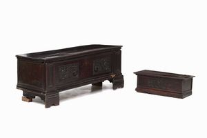 Lotto di una cassapanca in legno con fronte decorato con intagli a volute vegetali [..]