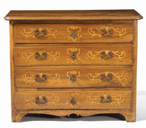 Cassettone intarsiato, fronte dritto a quattro cassetti. Piemonte XVIII secolo