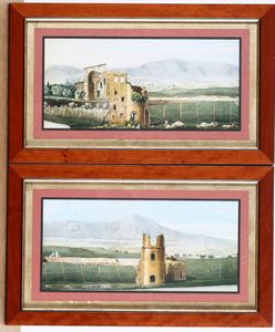Coppia di stampe raffiguranti paesaggi con rovine, XX secolo