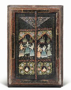 Specchio con cornice in legno dipinto a due ante. Persia, XIX secolo