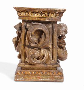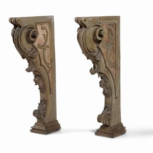 Coppia di sostegni in legno intagliato e scolpito in stile barocco