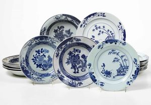 Lotto di 18 piatti in porcellana a decoro monocromo blu, Cina