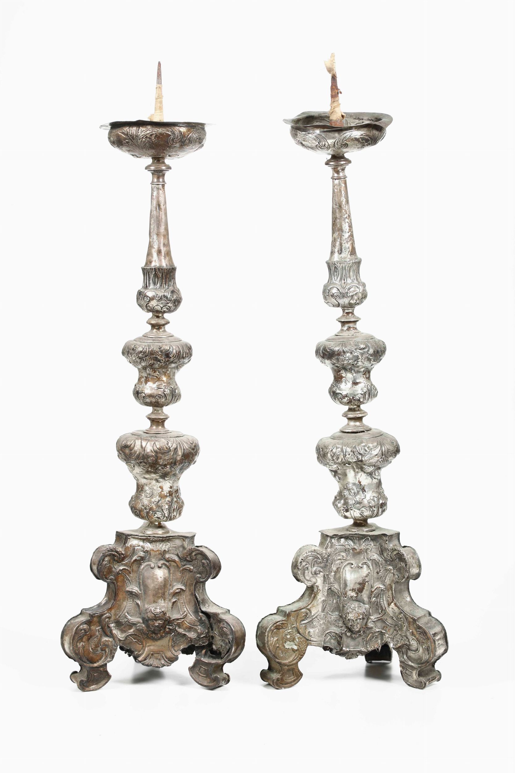 Coppia di antichi candelieri in rame argentato