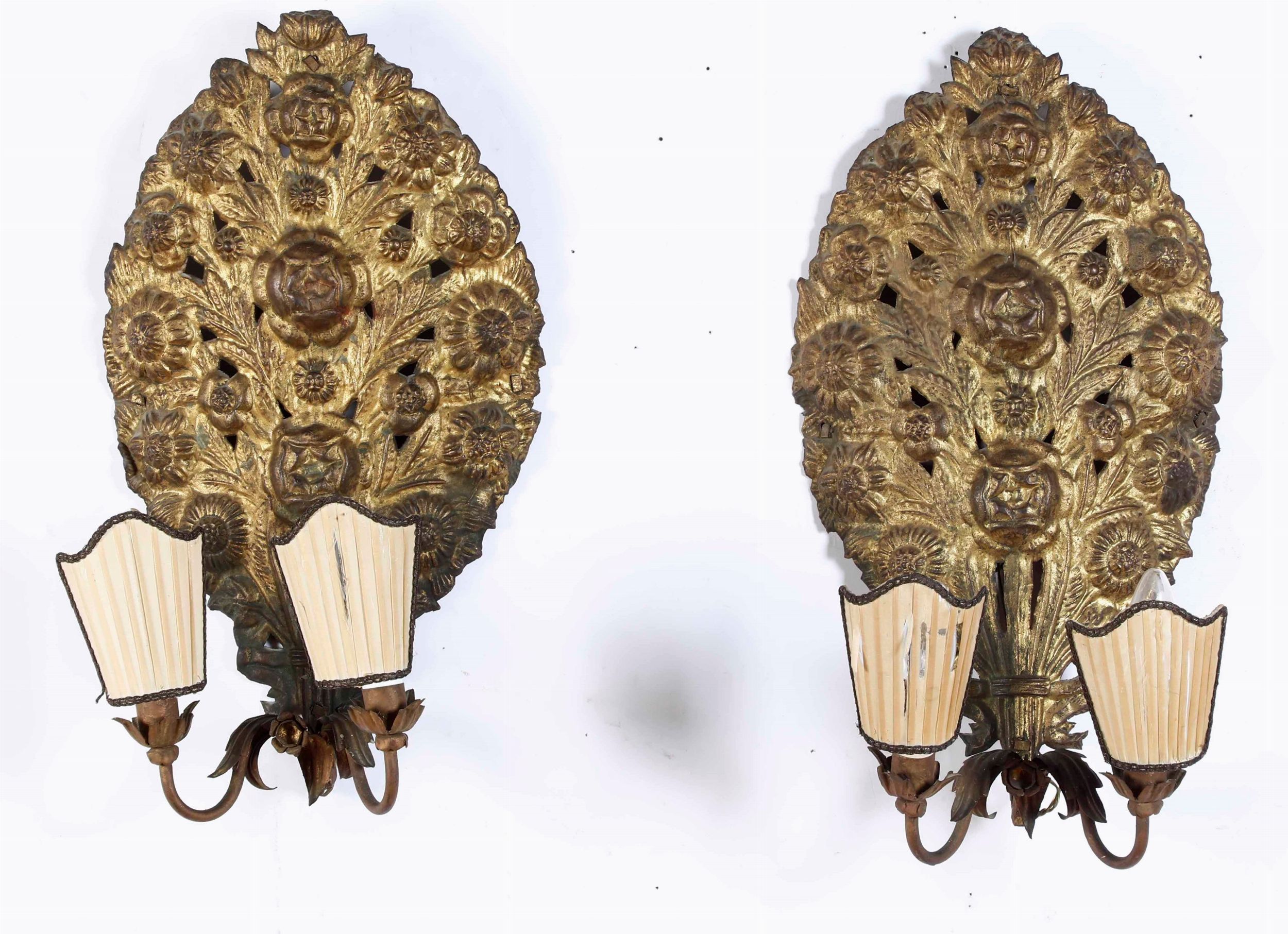 Coppia di appliques con struttura in metallo dorato, elementi antichi